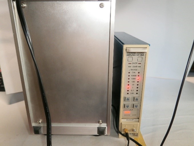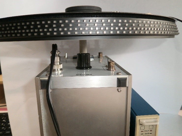 図2はレコード盤に取り付けた加速度ピックアップ,図3は加速度ピックアップの信号を増幅するチャージアンプです.この信号をオーディオプレシジョンのアナライザ(BANDPASS)で測定します.オーディオプレシジョンのスイープ信号で加振器を10.0mm/s2 で振動させ,プラッターを駆動します.