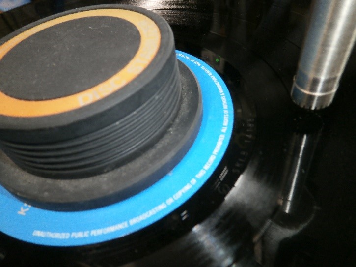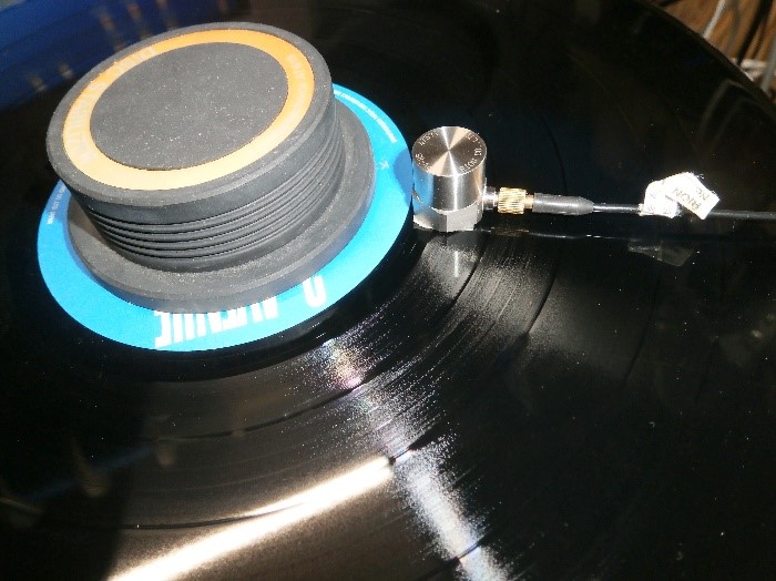 スピンドル部を一定の加速度で加振し,ターンテーブルシートの有無,そして従来のゴム製のターンテーブルシートとTS 1010を用いたときのレコード盤の加速度を測定してみました.図1は加振器に載せたレコードプレイヤーのプラッターです.