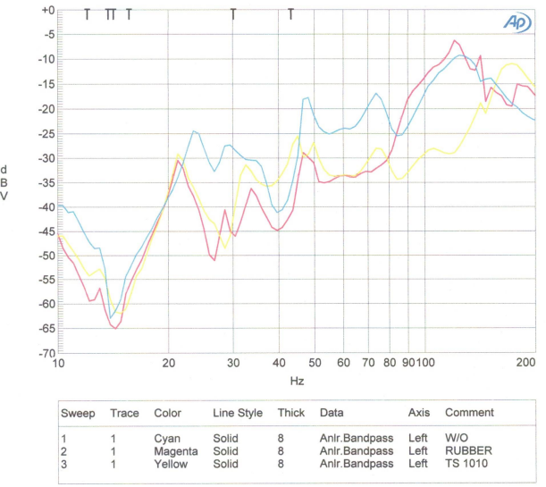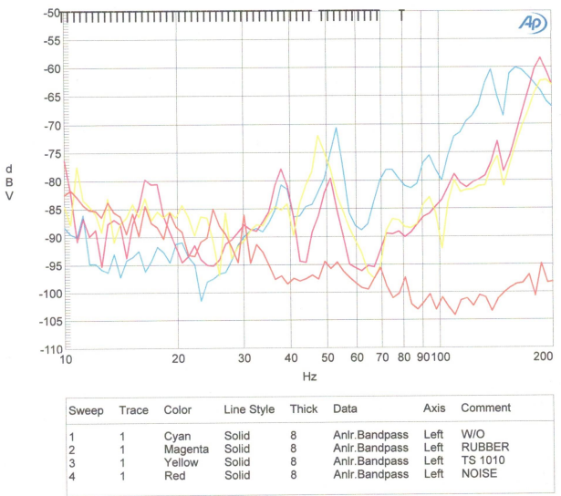 ゴム製のターンテーブルシートもTS 1010も60~160Hz の範囲でプラッターだけの時よりレコード盤から放射される音波は小さくなっていますが,ゴム製のターンテーブルシートとTS 1010の差は確認できません.一番下のカーブは測定環境の騒音のスペクトラムです.